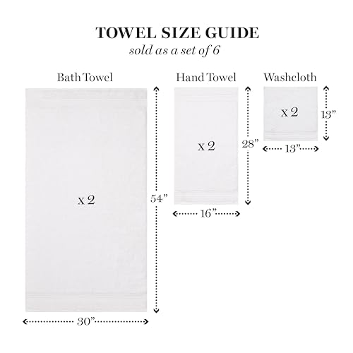 Das 6-teilige Set beinhaltet: 2 Badetücher (76,2 x 137,2 cm), 2 Handtücher (40,6 x 71,1 cm), 2 Waschlappen (33 x 33 cm)