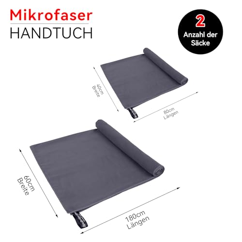 Enthaltene Produkte: Unser Mikrofaser Sporthandtuch Fitnessstudio Set enthält zwei Handtücher in unterschiedlichen Größen: ein großes (180*60 cm) und ein kleines (80*40 cm). Unsere Mikrofaser all-in-one Lösung erleichtert Ihren Tag in jeder Lebenslage!