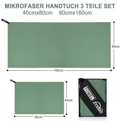 ZYXBBD Mikrofaser Handtuch 3er Set(160x80cm Groß Badetuch +2 Stück 80x40cm Klein Handtuch), Gestreiftes Strandtuch Reisehandtuch Schnelltrocknend Microfaser Handtücher für Fitness Strand,Reise Grün